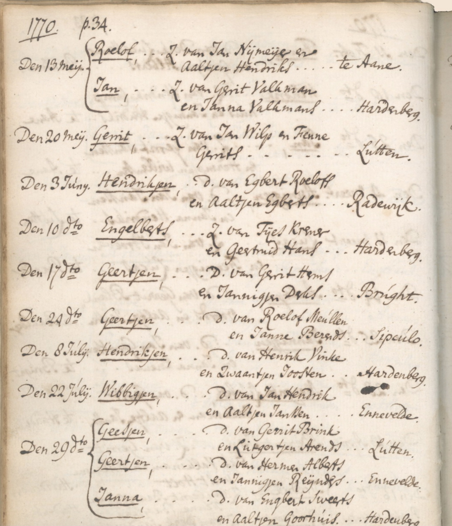 | DTB Kerspel Hardenberg 1762-1791, pagina 34 043.3DTB kerspel Hardenberg 10-06-1770 Engelberts, z. van Tijes Kremer van Geertruid Hans, Hardenberg Bestandnaam: nlzwhco_114_124_H231_020a.pdf Datering: [1770} 10-06-1770 Transcriptie: Engelberts, z. van Tijes Kremer van Geertruid Hans, Hardenberg dtbboek: Doopboek 1762-1791 Bron: DTB Kerspel Hardenberg | ||