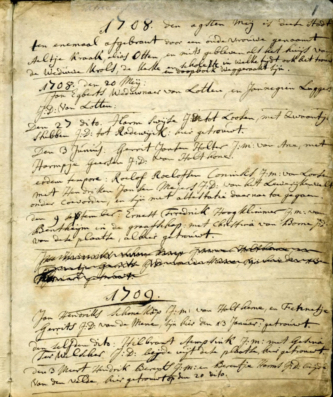 | Tekst | 1708 Den agsten meij is deese stadt ten enemaal afgebrant door een oude vrouwe genaamt Aeltje Kraak, alias Otten, en niets gebleven als het huijs van de weduwe Krols, de kerke en schole etc., in welke tijdt ook het trouw- en doopboek weggeraakt sijn. 1717 De 2 Meij: Roelof Alberts, j.m. van Holthone, tegenwoordig dienende op de Haandrijk, met Annetje Evers van de Scheer, j.d. 1719 De 9 April: Jan Kremer, j.m. uijt Hardenbergh, met Engele Hannink, j.d. tot Brogt | |